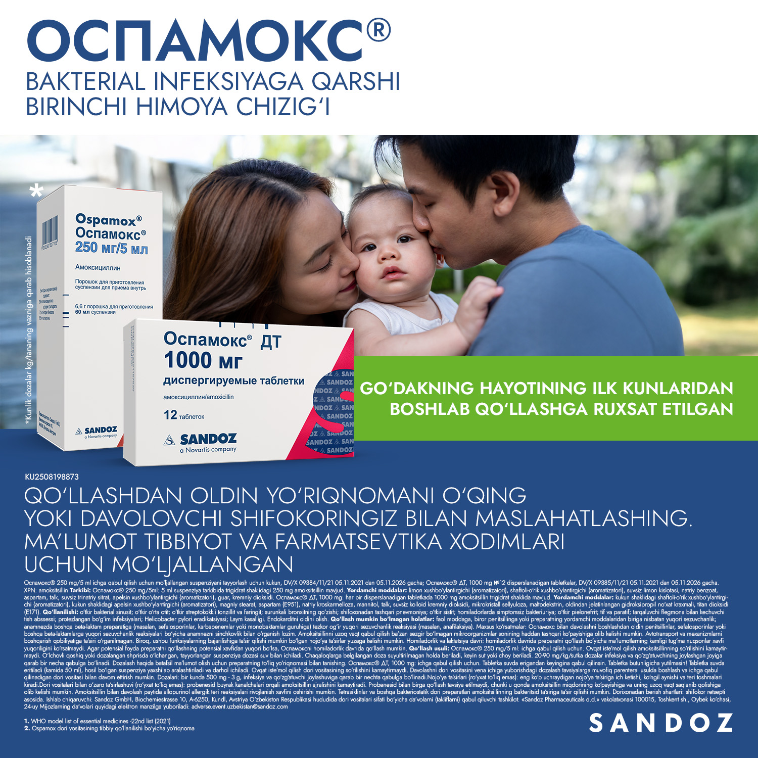 Har bir dispersiyalanadigan tabletka trigidrat ko'rinishida 1000 mg amoksisillin saqlaydi.